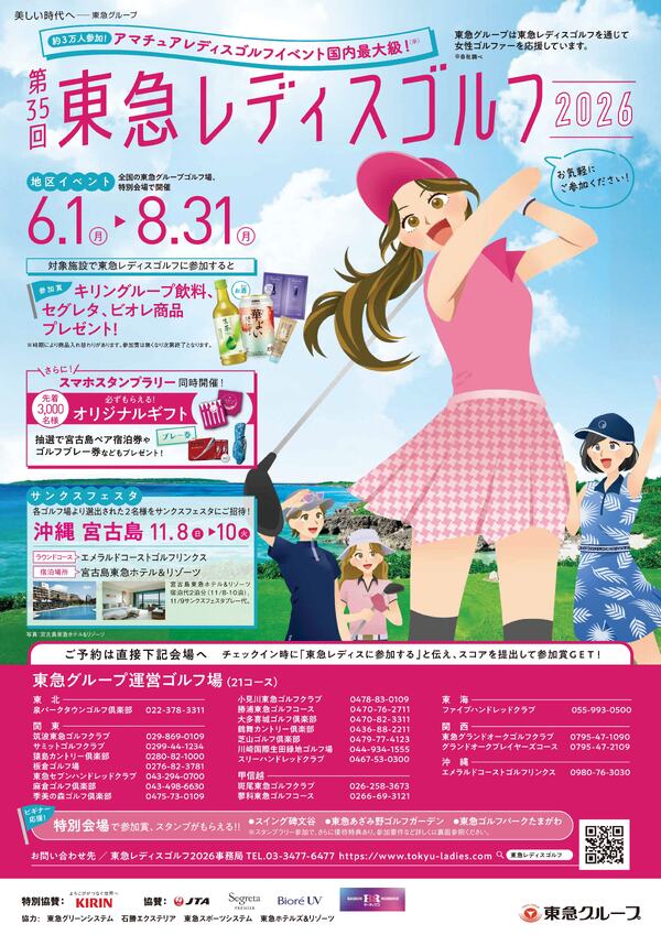 いよいよ、今年も6月1日より第35回目の東急レディスゴルフがスタートします! 今年のサンクスフェスタ会場は、エメラルドコーストゴルフリンクス(沖縄県・宮古島)。 今回もたくさんのスポンサーに支えられ、参加賞ならびにスマホスタンプラリーでは素敵な賞品を多数ご用意しております。 会場は東急グループ運営の「ゴルフ場21コース」と「特別会場3カ所」。今年もたくさんのご来場をお待ちしております。